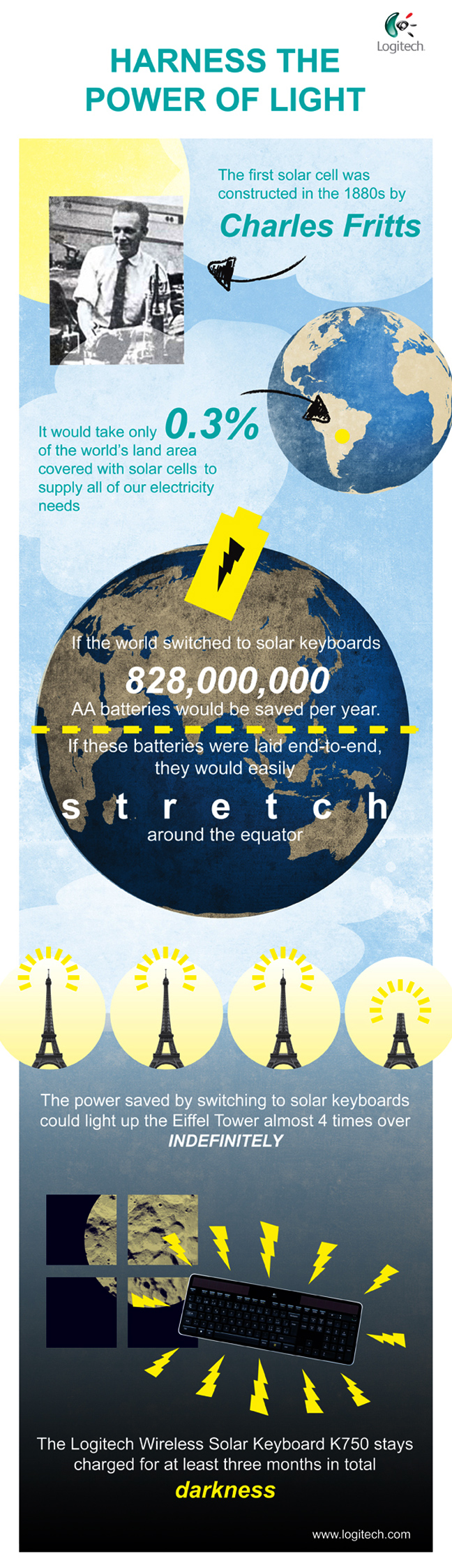 Καταρχήν αν όλος ο κόσμος χρησιμοποιούσε πληκτρολόγια Logitech Wireless Solar K750, θα εξοικονομούσαμε 828 εκατομμύρια μπαταρίες τύπου AA κάθε χρόνο. Αν μάλιστα βάζαμε αυτές τις μπαταρίες τη μία πίσω από την άλλη θα κάναμε τον κύκλο της γης! Ακόμη περισσότερο, η ενέργεια που θα εξοικονομούσαμε θα μπορούσε να φωτίσει σχεδόν 4 πύργους του Άιφελ κάθε χρόνο για πάντα!
